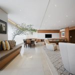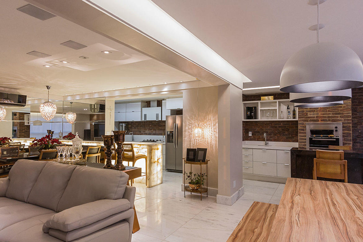 Para atender aos anseios do cliente de personalizar e integrar os ambientes, o projeto da arquiteta Raquel Montalvão comtemplava uma grande demolição e modificação das salas, varanda e cozinha. O piso foi totalmente substituído por um belíssimo mármore em grande formato, assentado cuidadosamente pela experiente equipe de Patrícia.
